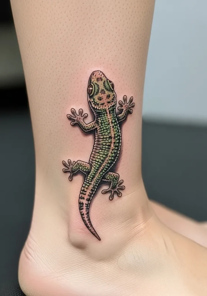This ankle tattoo features a tiny gecko climbing upward with a cute mix of greens, pinks, and speckled details. The realistic style makes the skin texture stand out and the big eyes add a touch of sweetness. The small size fits the ankle perfectly and makes it look like the gecko is gently perched on the skin.