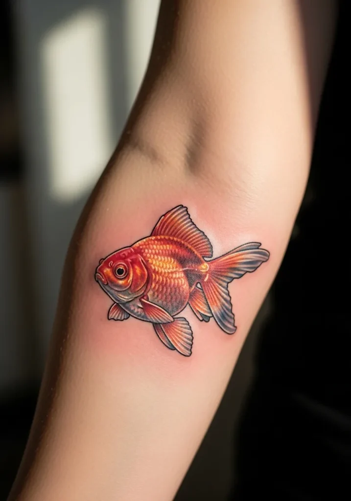 This arm tattoo features a lively goldfish bursting with glowing oranges and soft shimmering highlights. The small to medium size works beautifully here because it lets the fins spread out gracefully while keeping the design playful. You can see each tiny scale and subtle gradient along the body. The placement on the inner arm gives the fish a soft and sunny look when the light catches it.