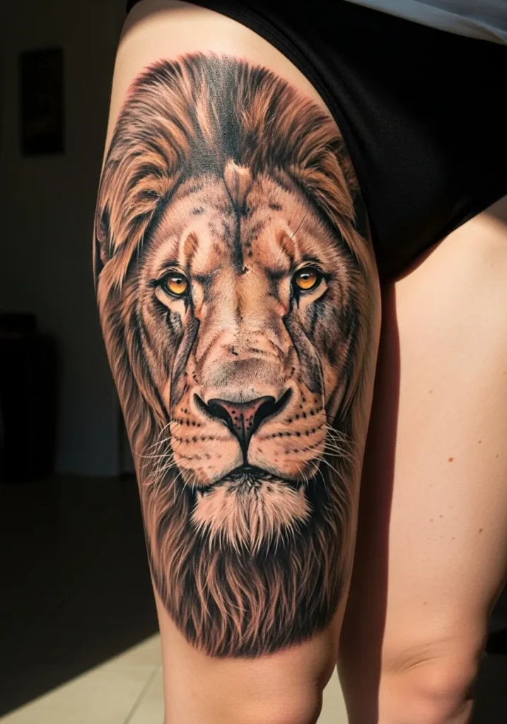 This thigh tattoo showcases a full lion portrait with a warm golden mane and soft shadow work that makes the fur look thick and touchable. The larger size gives the artist room to capture every strand and highlight. The eyes are a rich amber that practically glow in natural light. The placement on the upper thigh adds a bold yet intimate feel that works beautifully for a realism piece this detailed.