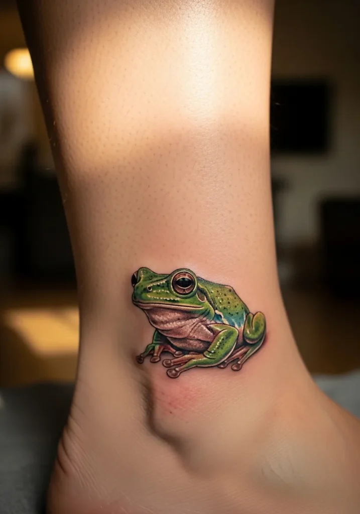 This ankle tattoo features a tiny green frog that looks like it could hop off the skin at any moment. The colors range from bright lime to deeper forest greens with a little brown shading on the belly. The small size makes it feel playful and tucked away while the high level of detail in the eyes and skin texture keeps it looking refined. The placement near the ankle bone is adorable and adds a soft pop of color without feeling overwhelming.