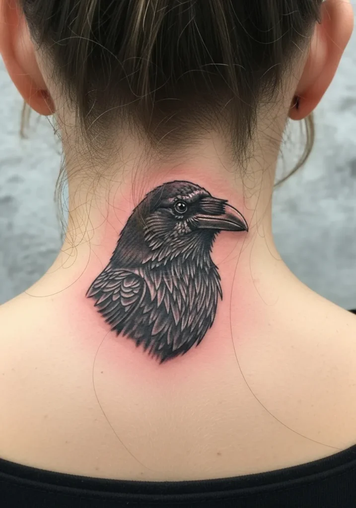 This back of the neck tattoo features a sharp looking raven with deep black feathers and bright highlights that bring out its intelligent gaze. The small to medium size works beautifully for this area and gives the neck a dramatic focal point. The feather details are crisp and layered which makes the bird feel full and dimensional. The soft pink background glow adds a gentle warmth to the darker tones.