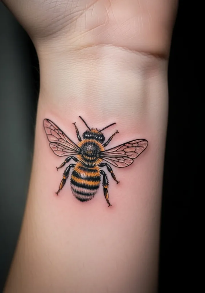 This wrist tattoo shows a small honeybee with transparent wings, fuzzy texture, and warm yellow stripes that stand out softly against the skin. The size is petite but the detail is sharp. Every little line in the wings and tiny hairs on the body help bring the bee to life. The placement on the inner wrist makes it easy to admire throughout the day.