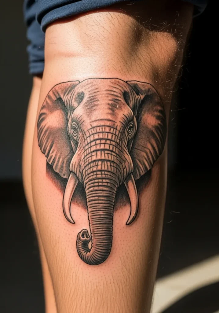 This leg tattoo shows a detailed elephant head with long tusks and textured wrinkles that give the piece so much character. The shading uses warm greys and soft black tones that make the elephant look gentle and wise. The medium size fills the side of the leg in a really flattering way and the placement adds a grounded presence to the overall look.
