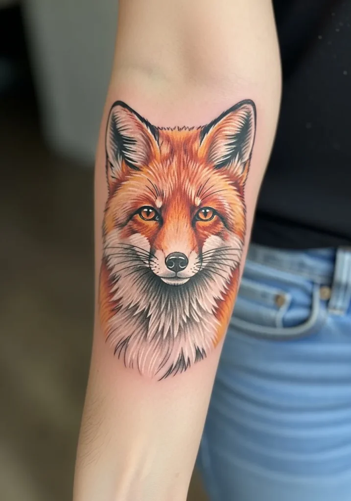This forearm tattoo features a bright red fox with soft white fur along the cheeks and chest. The medium size gives enough room for rich color blending and the eyes have that warm, clever sparkle foxes are known for. The style blends smooth shading with crisp linework which gives the whole piece a clean and polished look. The placement keeps the fox facing outward which makes it eye catching from every angle.