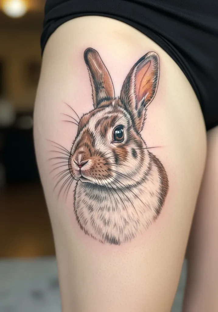 This thigh tattoo shows an adorable rabbit with soft fur patterns and big shiny eyes. The shading moves gently between browns and creams, giving the fur a fluffy look. The medium size fills the area well and adds a sweet charm to the thigh. The realistic style brings out the tiny whiskers and rounded cheeks in the cutest way.