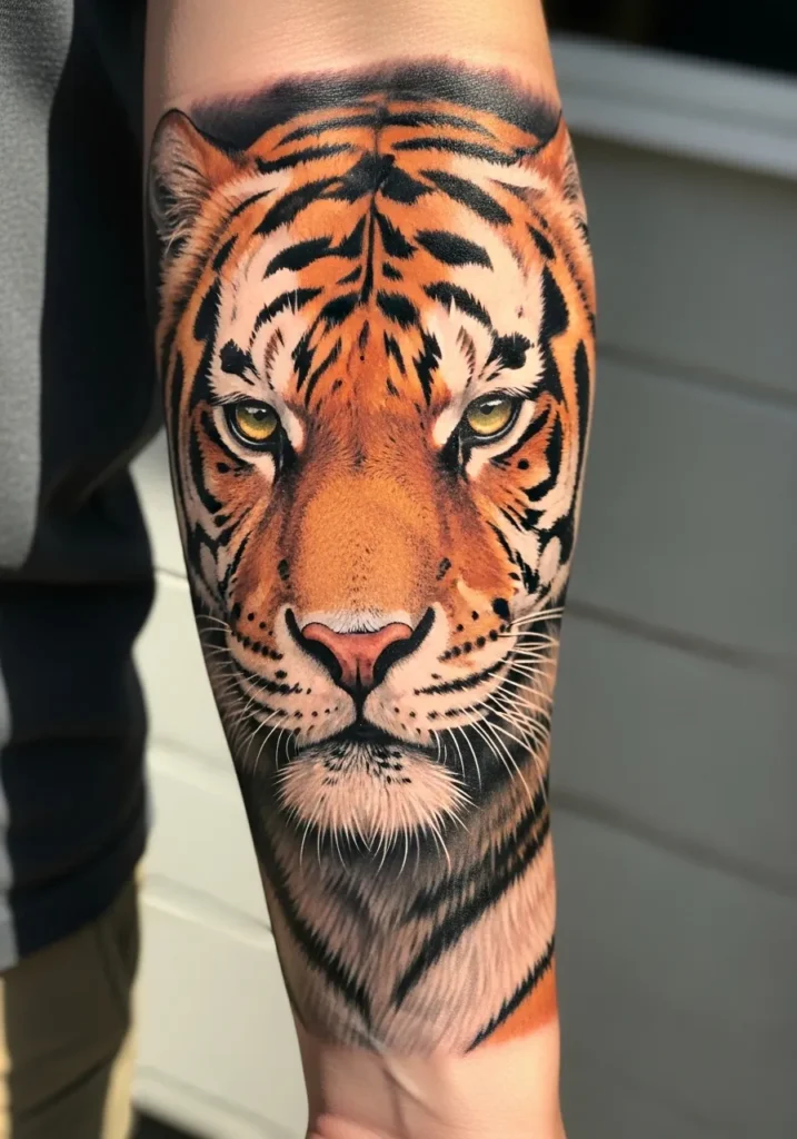 This stunning forearm piece shows a tiger portrait that feels almost alive. The style leans fully realistic with bold orange tones, deep black stripes, and soft shading that blends smoothly across the skin. The size is fairly large, stretching from wrist to elbow, which gives the tiger plenty of room for those gorgeous details like the textured fur, piercing amber eyes, and subtle highlights around the muzzle. Everything comes together with a polished finish that makes the tattoo stand out beautifully.