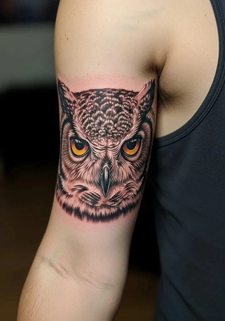 This upper arm tattoo showcases an owl face with rich orange eyes and layers of detailed feathers. The style blends fine linework with soft shading to create a textured and expressive look. The medium size wraps the arm nicely and makes the owl feel bold without overpowering the whole area.