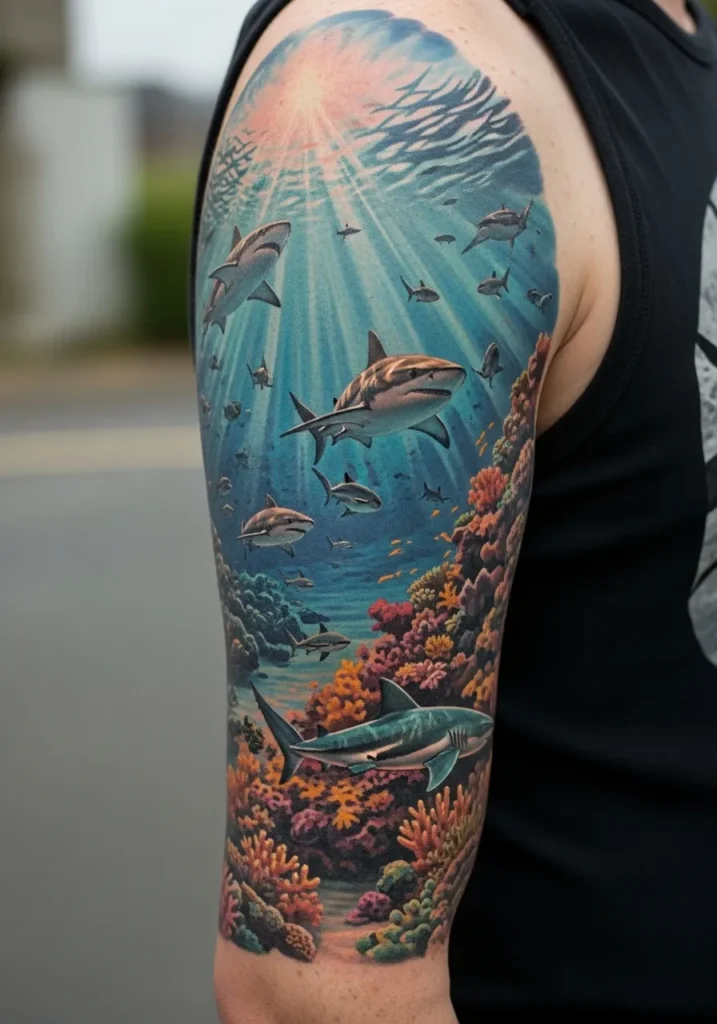 I can t get over how immersive this tattoo feels. It s like a portal to another world one filled with movement, depth, and wild beauty. The sharks add a sense of strength and mystery, while the coral reef softens it with natural vibrancy. It s a statement piece for anyone who feels most alive near the ocean.