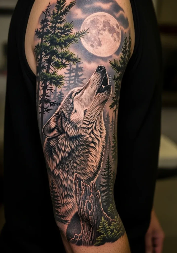 This breathtaking sleeve captures a howling wolf under a full moon, surrounded by pine trees and misty night skies. The black and gray realism gives it a cinematic atmosphere, with every strand of fur and wisp of cloud drawn to perfection. The composition flows beautifully from the shoulder to the elbow, creating a natural, storytelling effect.