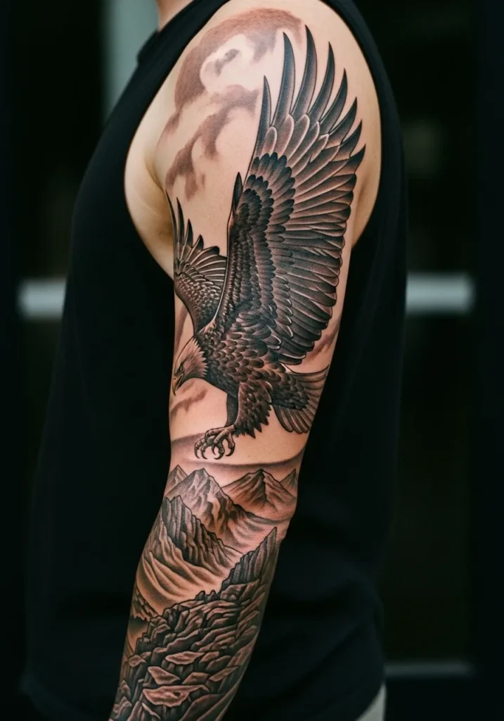 This powerful full sleeve tattoo captures the raw strength and grace of a soaring eagle set against a rugged mountain backdrop. Inked in rich black and gray realism, every feather and fold of its wings is meticulously detailed, creating incredible depth and movement as the bird swoops down through the clouds. The sleeve flows seamlessly from the shoulder to the wrist, with rocky terrain and soft sky tones that add dimension and storytelling to the piece. It s bold, timeless, and beautifully balanced in scale and shading.