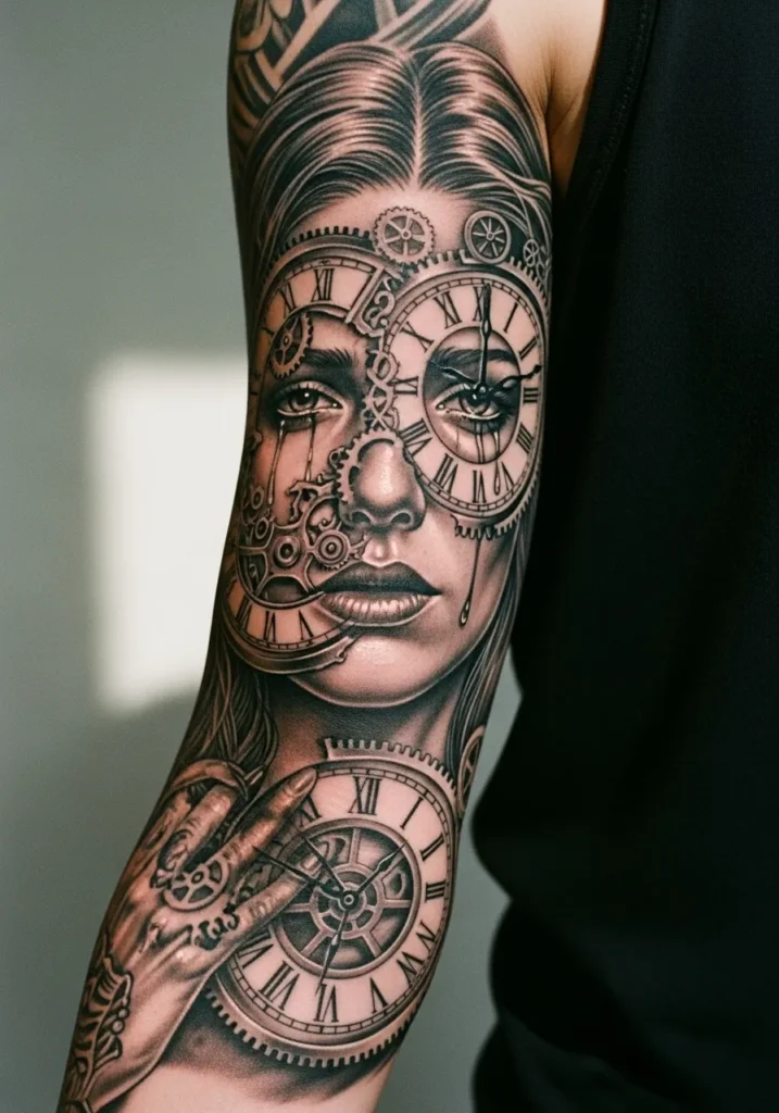 This striking realism sleeve combines a female portrait with intricate clockwork and mechanical gears. The design uses grayscale shading to highlight every cog, Roman numeral, and metallic texture with lifelike precision. The flowing composition wraps beautifully around the arm, creating a seamless blend of beauty and machinery.