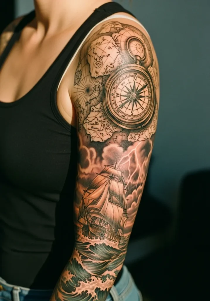 This full sleeve tattoo blends adventure and artistry with a striking realism style. It features an old sailing ship braving stormy seas, guided by a large compass and vintage world map wrapping around the upper arm. The piece uses smooth shading and muted tones of brown, gray, and black to create a timeless, weathered look. Lightning flashes across the sky, adding drama and energy to the composition.