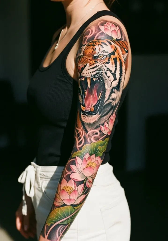 This breathtaking realism sleeve features a roaring tiger surrounded by blooming lotus flowers. The vivid orange of the tiger contrasts beautifully with the soft pink petals and lush green leaves, creating a perfect mix of power and serenity. The composition flows gracefully down the arm with amazing precision.