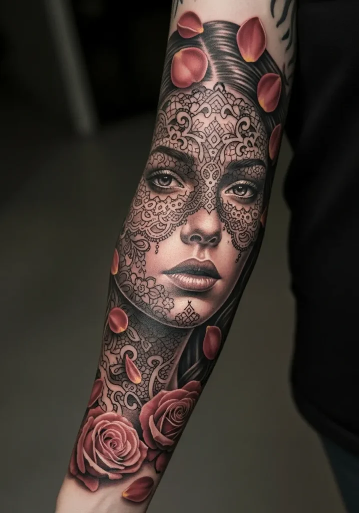 This stunning realism sleeve features a woman s face adorned with intricate lace patterns and surrounded by red roses and soft petals. The black and gray shading pairs beautifully with the warm tones of the roses, creating an elegant and mesmerizing contrast. Every fine line in the lace feels delicate and intentional, flowing perfectly with the natural curves of the arm.