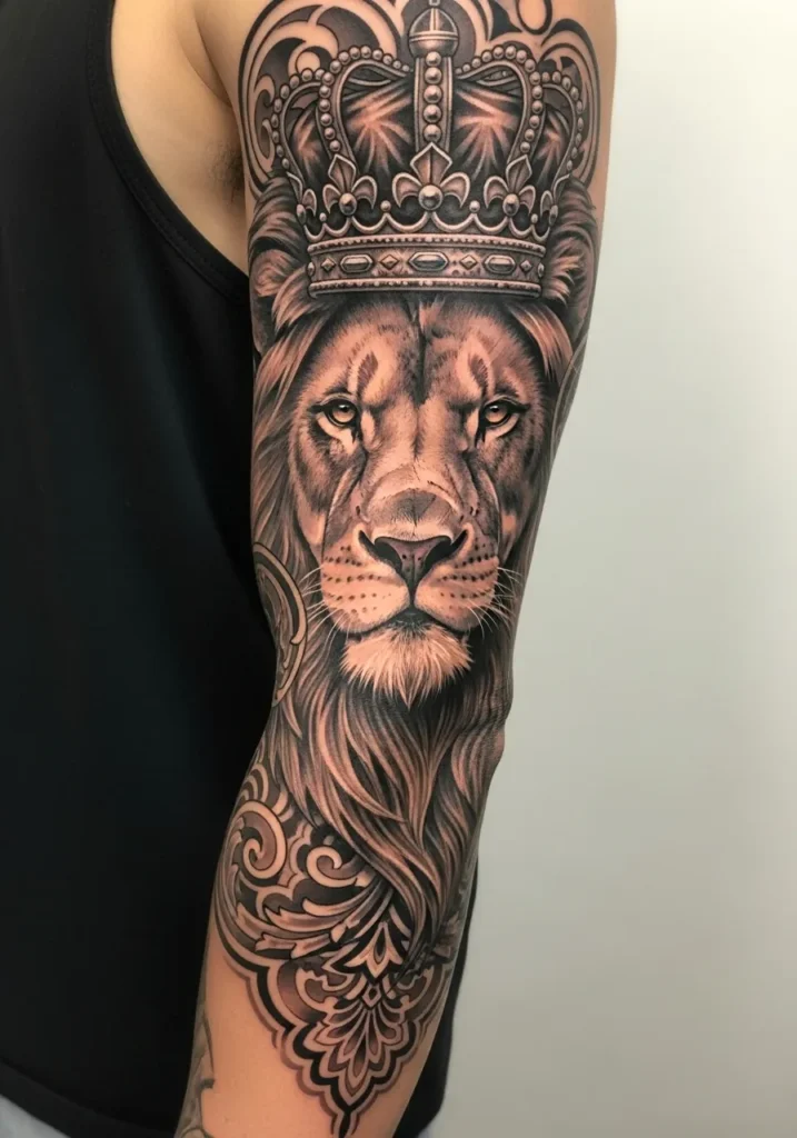 This majestic realism sleeve showcases a lion wearing a detailed crown, surrounded by ornamental patterns that frame the design perfectly. The shading and texture work bring the lion s mane to life, giving it power and grace. The piece covers the entire arm, creating a commanding and noble appearance.