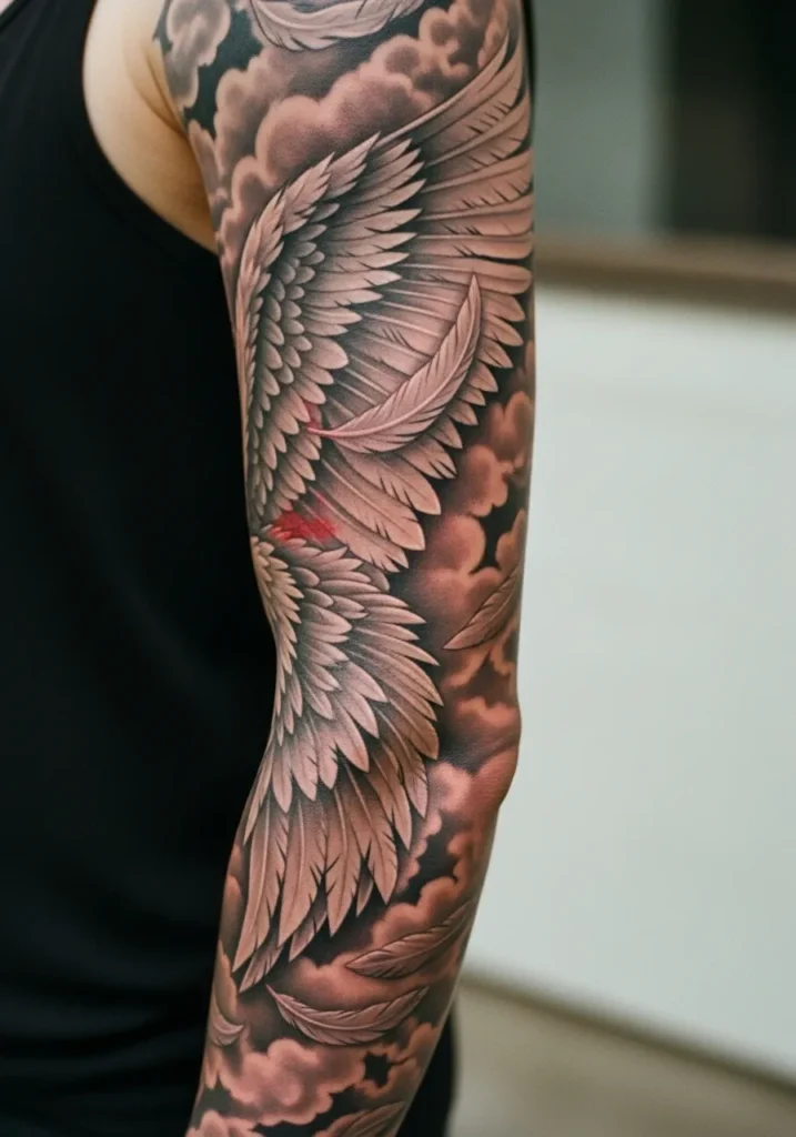 This beautiful realism sleeve features large angel wings stretching across the arm, layered with soft clouds that add depth and motion. The feathers are shaded with incredible precision, each one highlighted to create a realistic, three-dimensional look. The warm undertones and subtle shadows make the entire piece feel ethereal and calm.