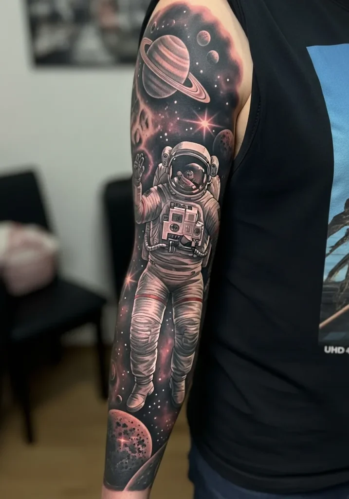 This realism sleeve takes art to another world with an astronaut floating through space surrounded by planets and galaxies. The deep black background and glowing pink and orange tones give the design a luminous, cinematic look. Every crease in the spacesuit and shimmer of starlight feels unbelievably real.