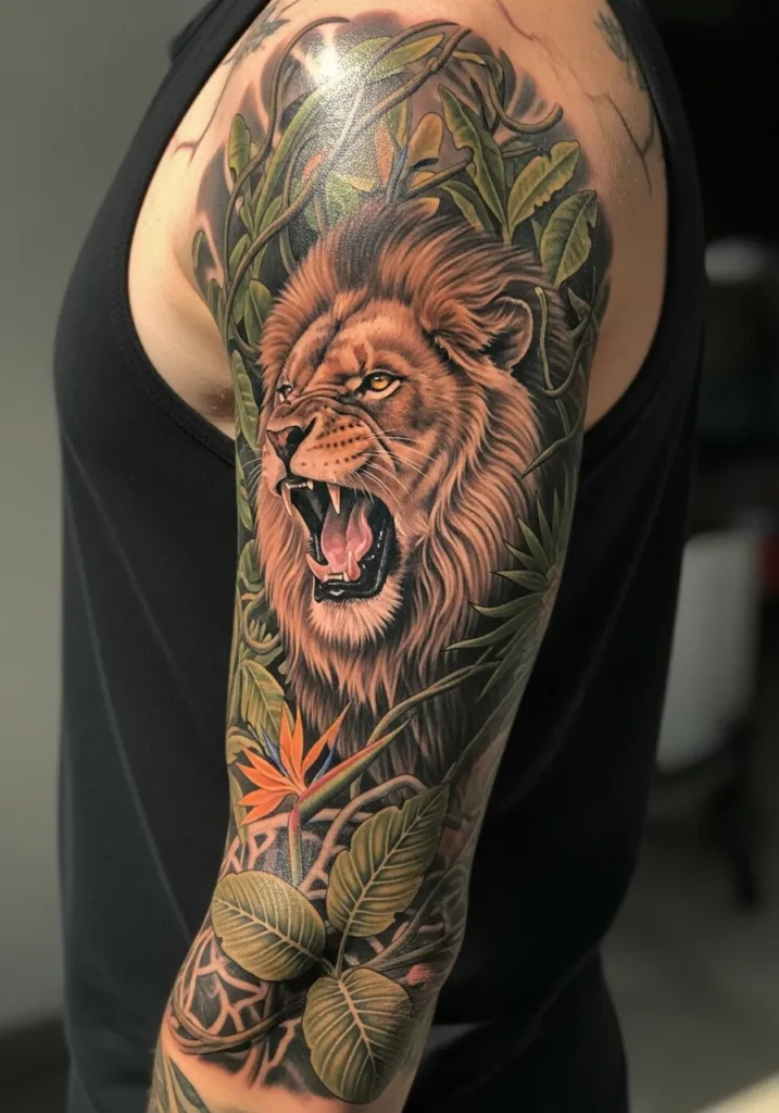 This hyper-realistic lion sleeve is pure strength inked into skin. The design features a roaring lion emerging from lush jungle foliage, with vivid green leaves and earthy tones that frame the majestic beast perfectly. The texture and shading make every strand of fur and every vein in the leaves stand out. The sleeve extends from the shoulder down, blending natural elements like vines and flowers into the composition for a cohesive and lifelike finish.