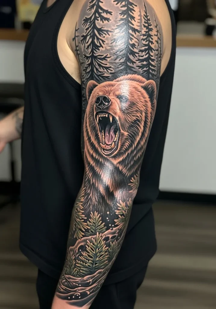 This striking realism sleeve showcases a roaring grizzly bear surrounded by pine trees and forest shadows. The detailed fur, glinting teeth, and lifelike textures make the bear look powerful and raw. The mix of warm brown and soft black tones gives it a wild, natural energy that flows perfectly down the arm.