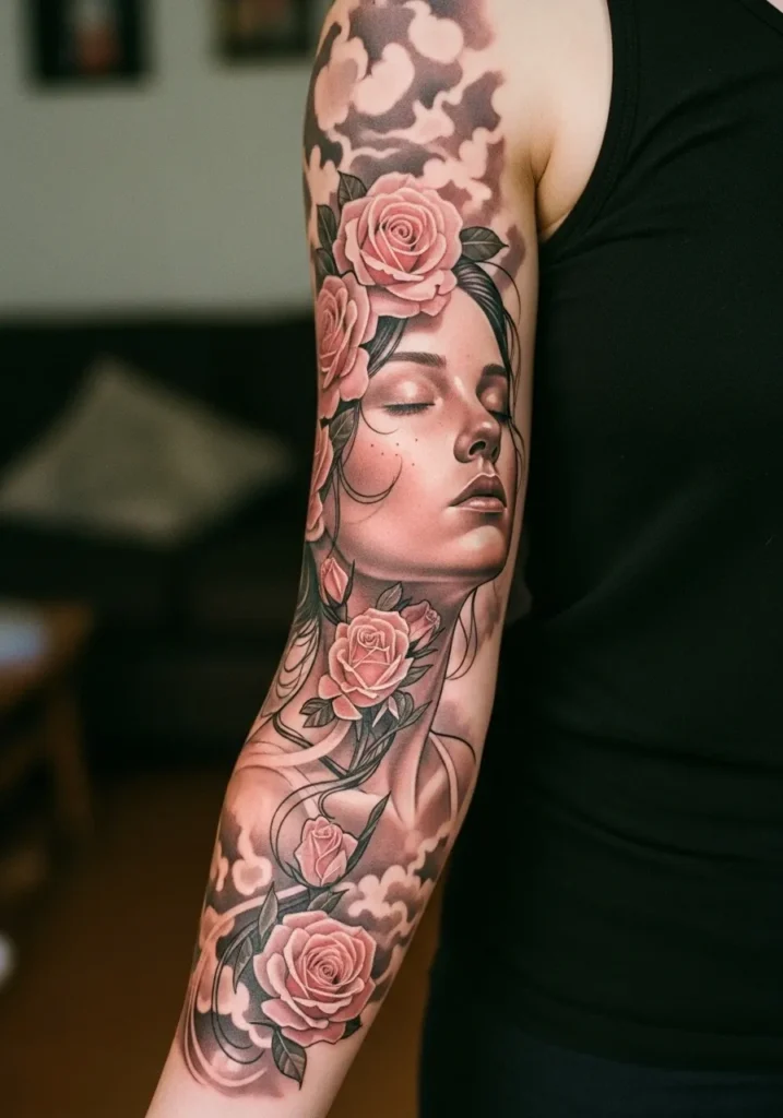 This full sleeve tattoo features a stunning realism design of a serene female face surrounded by soft pink roses and swirling clouds. The artwork extends from shoulder to wrist, using a mix of smooth shading, muted tones, and gentle highlights to create lifelike depth. The subtle redness around the fresh ink and delicate gradients make every rose petal and facial feature feel natural and soft.