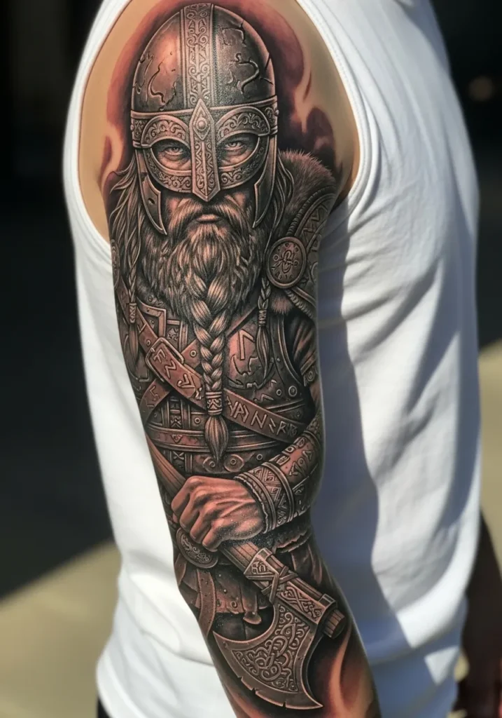 This realism sleeve portrays a Viking warrior in full armor, gripping an axe with strength and determination. The shading and depth work create a sense of realism that almost feels like the warrior could step right out of history. From the intricate helmet engravings to the textured fur and braided beard, every detail is perfectly crafted.