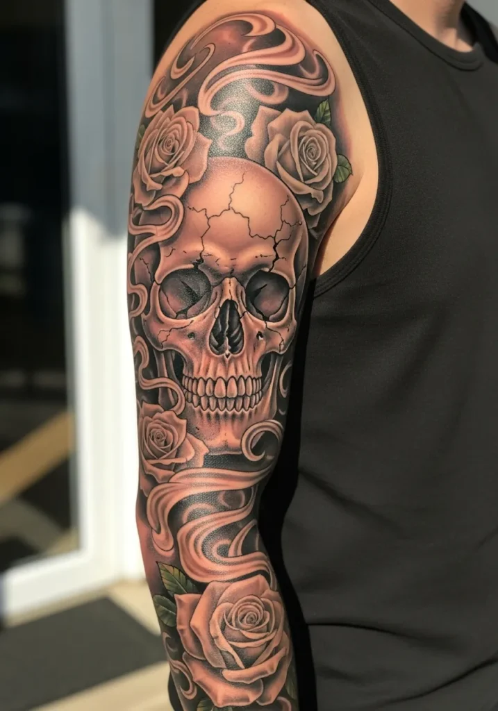 This classic realism sleeve combines dark beauty and symbolism in one bold piece. A detailed skull takes center stage, surrounded by swirling smoke and blooming roses. The mix of soft pink tones and dark shadows gives it a haunting yet elegant look, covering the entire upper arm in a seamless flow.