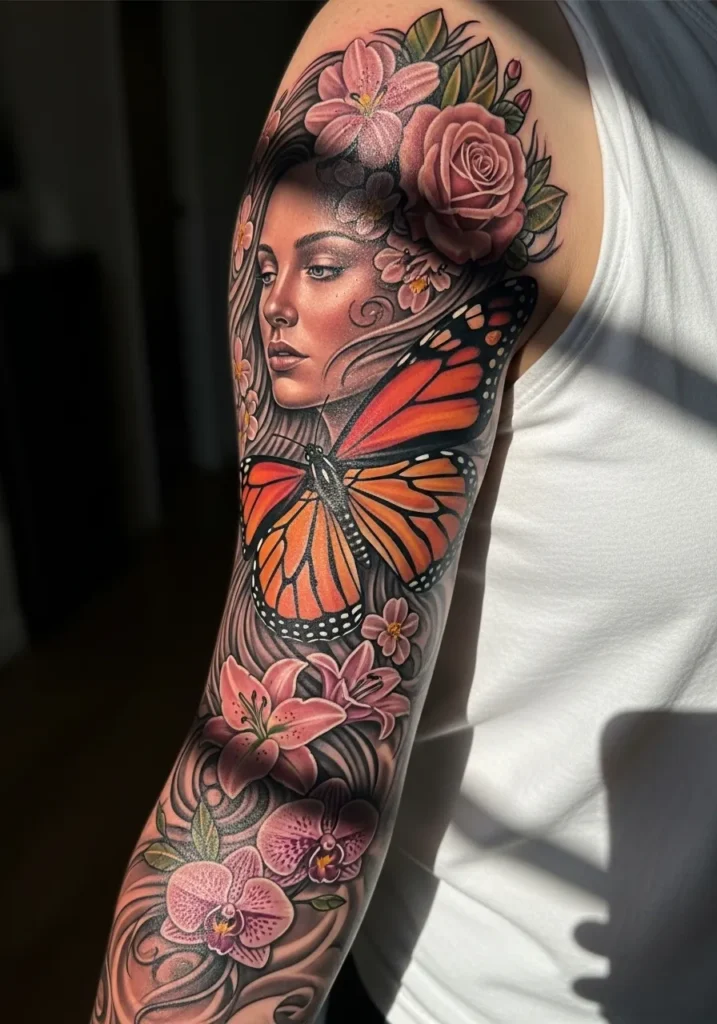 This colorful realism sleeve combines beauty and symbolism with a delicate female portrait surrounded by flowers and a vibrant monarch butterfly. Shades of pink, orange, and soft green blend effortlessly with black outlines to create a graceful flow. The tattoo captures both strength and gentleness, covering the arm in soft, natural tones.