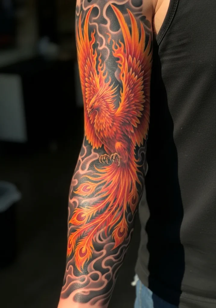 This powerful realism sleeve bursts with color and motion, featuring a phoenix rising through swirling smoke and flames. Shades of red, orange, and gold blend together to create a radiant glow that feels almost alive. The intricate feather detailing and dramatic contrast against the black background make the artwork truly mesmerizing, flowing perfectly along the arm.