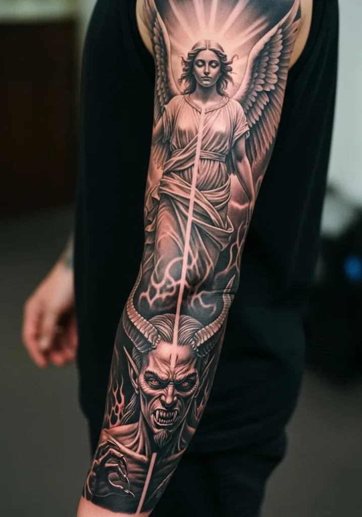 This powerful black and gray realism sleeve showcases the eternal clash between light and dark. An angel, glowing with radiant light, towers above a menacing demon below, with lightning-like energy dividing them. The shading work and divine glow make the contrast feel intense and symbolic, stretching from the shoulder down to the forearm.
