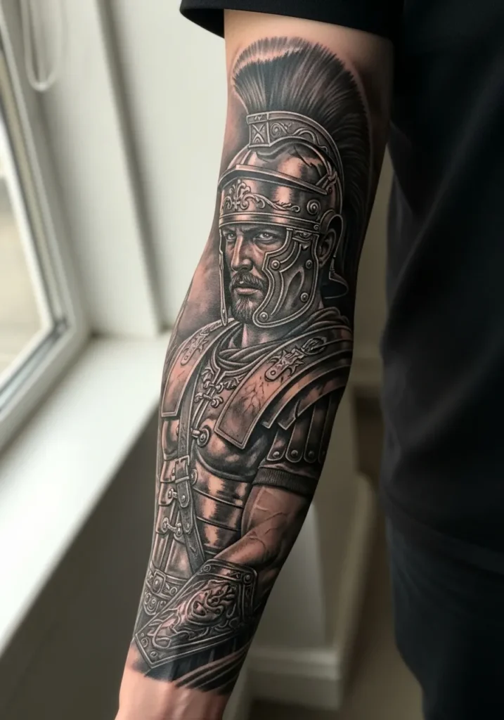This dramatic realism sleeve captures the image of a Roman soldier in detailed armor, complete with a plume-topped helmet and intense expression. The grayscale shading brings out every metallic reflection and texture, giving the armor a sense of weight and realism. The sleeve wraps seamlessly around the arm, creating a cinematic look that feels straight out of history.