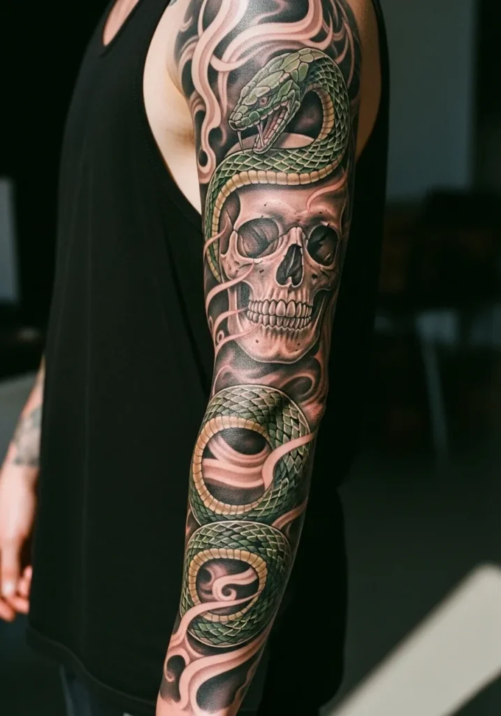 This dramatic realism sleeve features a skull entwined by a green serpent, all surrounded by smoky pink and black shading. The mix of realism and color contrast makes it visually gripping. The scales of the snake shimmer with lifelike detail, while the skull adds a darker, mysterious tone that wraps the entire arm beautifully.