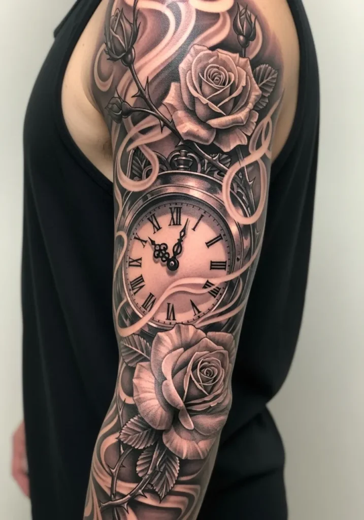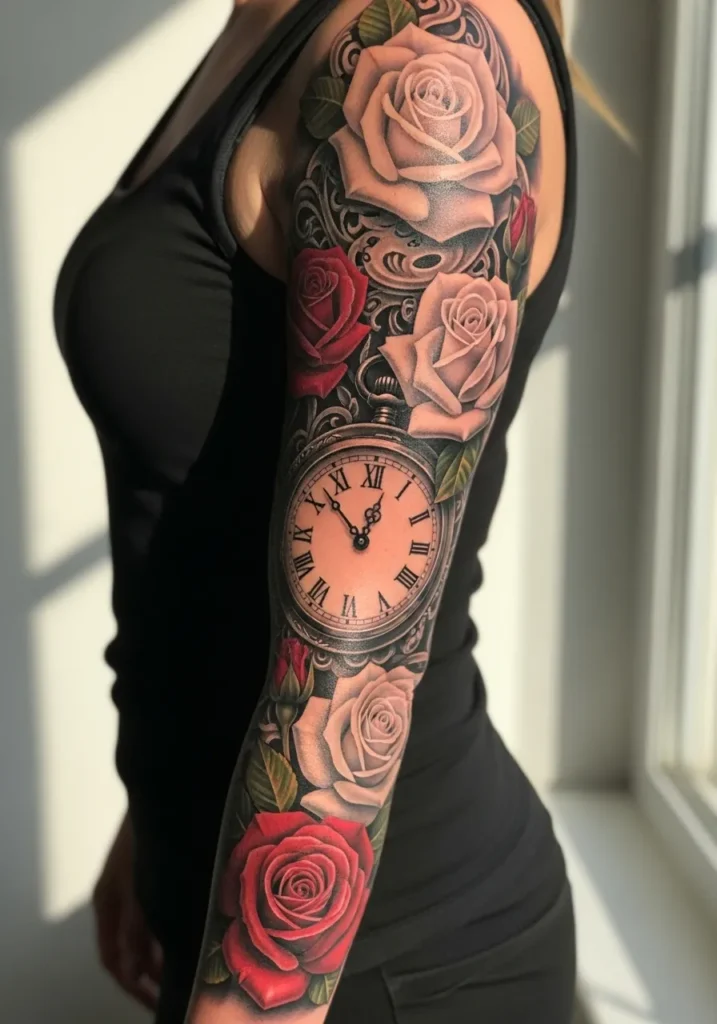 This feminine yet striking sleeve blends realism and symbolism in a breathtaking display of artistry. The design wraps around the arm with layers of soft pink and deep red roses surrounding a classic pocket watch. The intricate metallic details of the clock contrast beautifully with the velvety petals, while the green leaves add natural depth. The color palette is warm and romantic, with each element crafted to perfection every petal, every highlight feels alive.