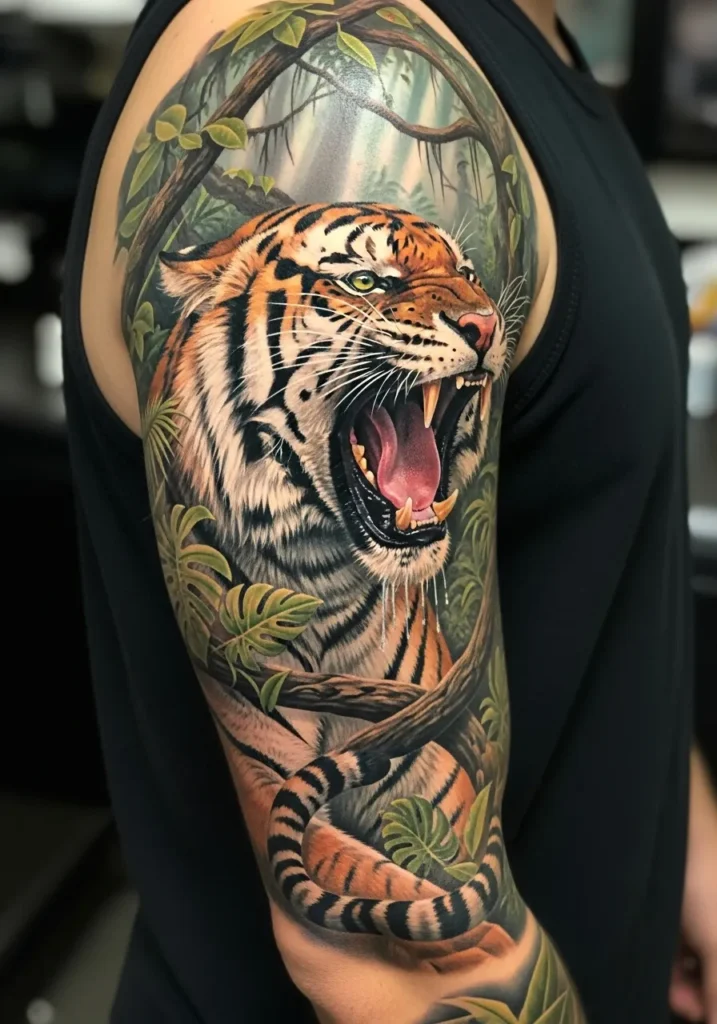 This vibrant realism sleeve bursts with color and energy, showing a roaring tiger surrounded by tropical foliage. The orange and black fur looks almost touchable, while the greenery adds vivid contrast. The details in the fur, whiskers, and teeth make the animal come alive, turning the entire arm into a wild jungle scene.