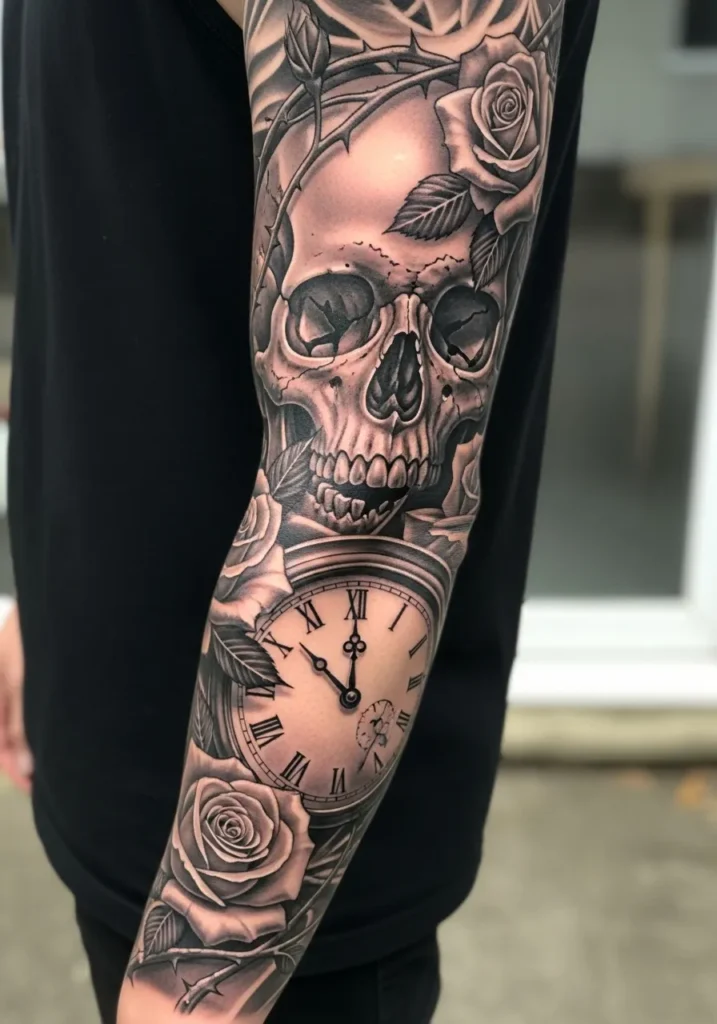This classic realism sleeve merges dark symbolism with intricate detail. A skull sits above a vintage clock surrounded by roses and thorned vines, all shaded in rich black and gray tones. The smooth gradients and realistic highlights make every petal, crack, and curve pop with depth.