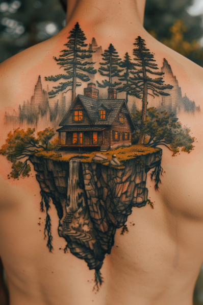 This stunning tattoo depicts a floating island, with a cozy house sitting on top, surrounded by trees and natural scenery. The island appears to hover in mid-air, with detailed rock formations and roots hanging down beneath it. The house, lit from within, gives a warm, inviting feel, while the surrounding trees and greenery add a touch of nature and serenity to the scene. The floating island concept adds a sense of fantasy and escape, making the design feel magical and otherworldly.