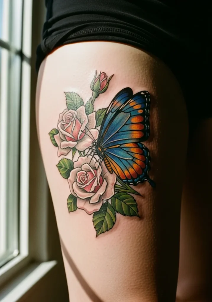 This vibrant tattoo showcases a large blue and orange butterfly resting among soft pink roses, all rendered in fine detail on the upper thigh. The colors are rich and luminous, especially under natural light, while the realistic petal textures make it feel like a living artwork. The design s placement enhances its delicate beauty while still standing out boldly.