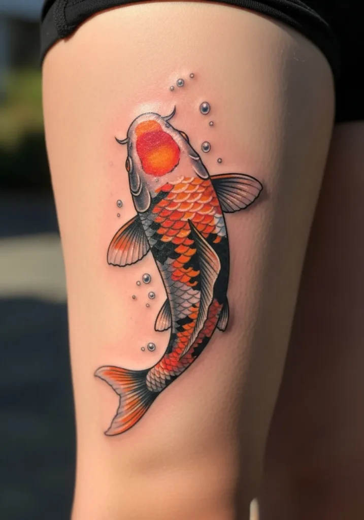 This colorful thigh tattoo brings a vibrant koi fish to life with shades of orange, black, and white, swimming gracefully upward through bubbles. The shimmering scale work and flowing tail make it look like it s in motion, catching light beautifully on the skin.