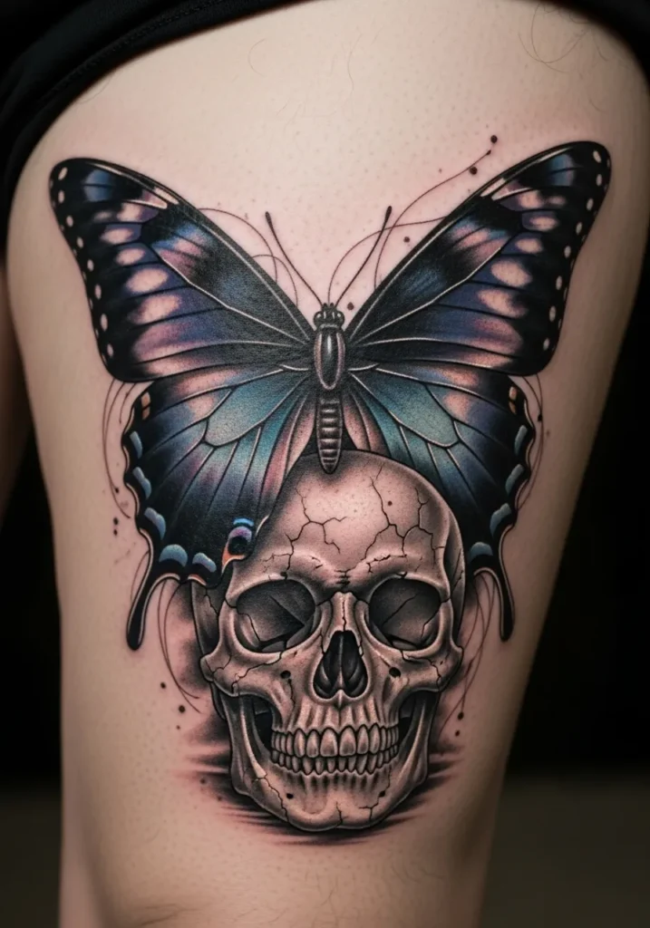 This piece combines a soft blue butterfly perched atop a cracked skull, merging life and death into one striking design. The butterfly s shimmering wings contrast beautifully against the textured skull, giving it a balanced mix of darkness and light. The medium size fits the thigh perfectly, keeping it bold yet artistic.