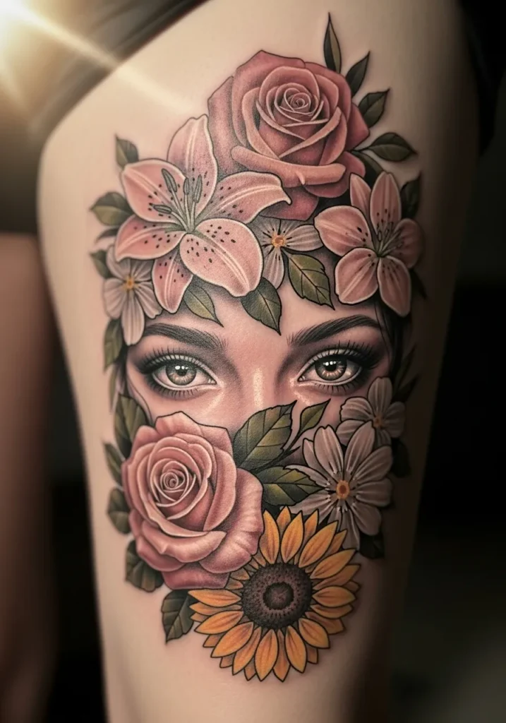 This captivating thigh tattoo shows a pair of realistic eyes framed by a mix of pink roses, lilies, daisies, and a sunflower. The shading gives the skin a soft glow, while the floral details make it rich with color and emotion. The combination of eyes and blooms creates a mysterious, elegant look that feels alive.