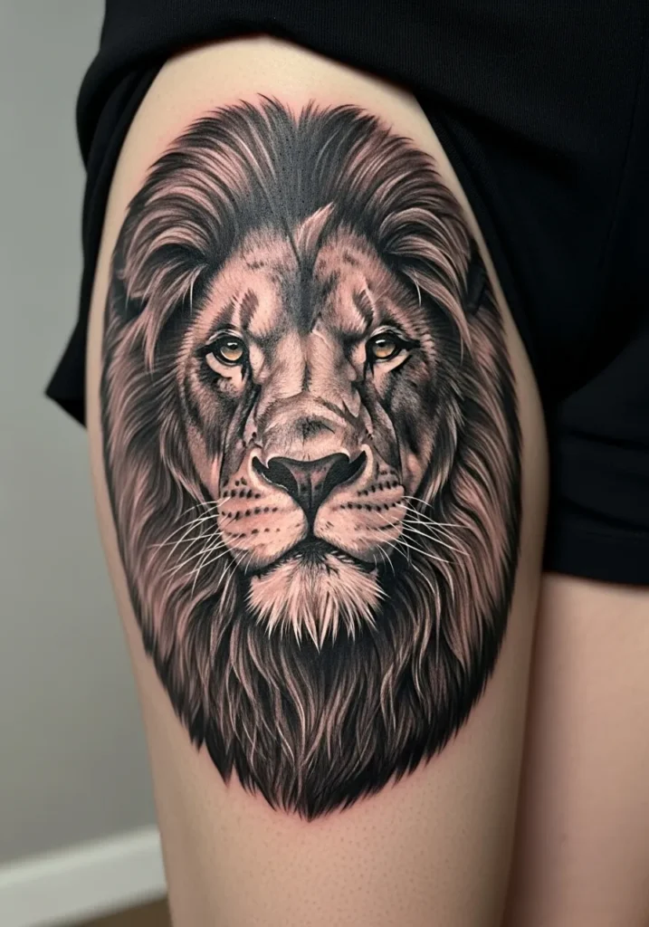 This powerful lion tattoo captures every strand of fur and each glint in the animal s eyes with stunning precision. The black and grey shading gives it a lifelike texture, while the proud, centered face commands attention. Placed on the upper thigh, it s bold but beautifully balanced.