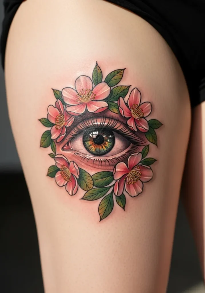 This thigh tattoo centers on a realistic green eye surrounded by pink blossoms and vibrant green leaves. The colors are rich and lifelike, with every petal and lash drawn with meticulous care. The placement gives it a mysterious vibe, and the circular composition feels harmonious and artistic.