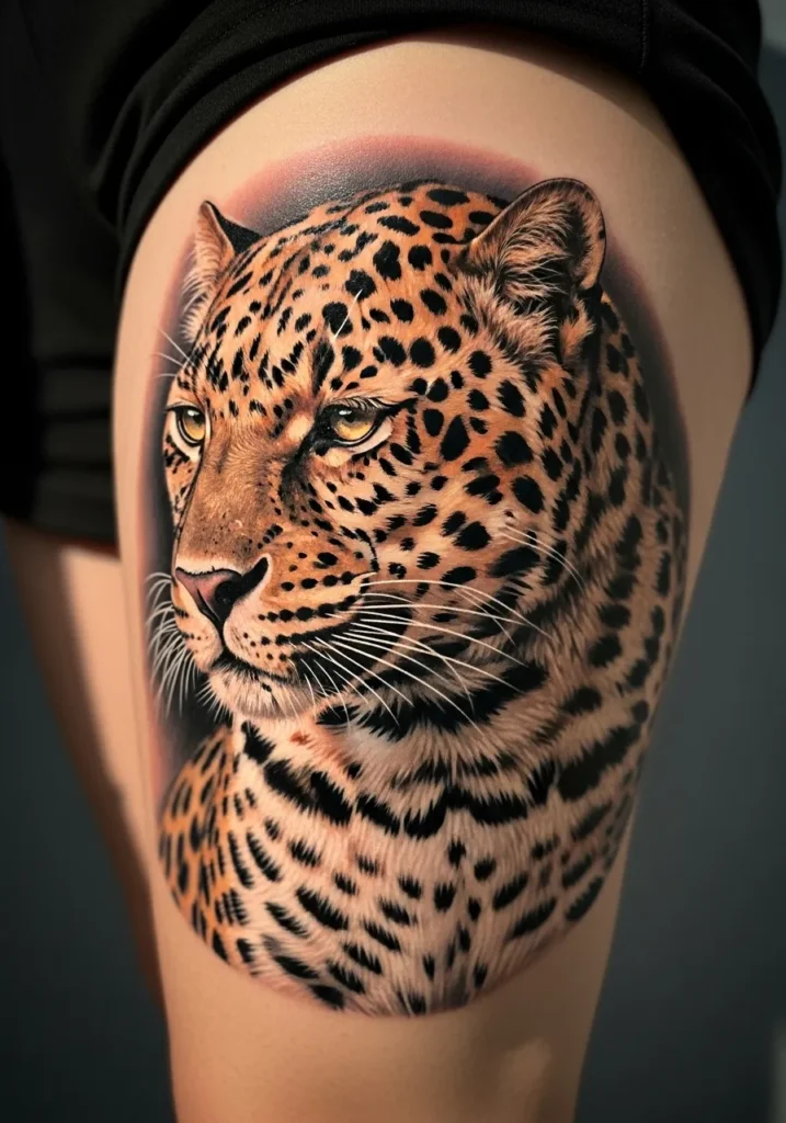 This hyper-realistic leopard tattoo captures the animal s strength and grace in exquisite detail. The golden fur, precise black spots, and lifelike eyes make it seem like the big cat is quietly observing from the skin itself. The placement on the thigh adds to the bold impact, creating a fierce yet elegant statement piece.