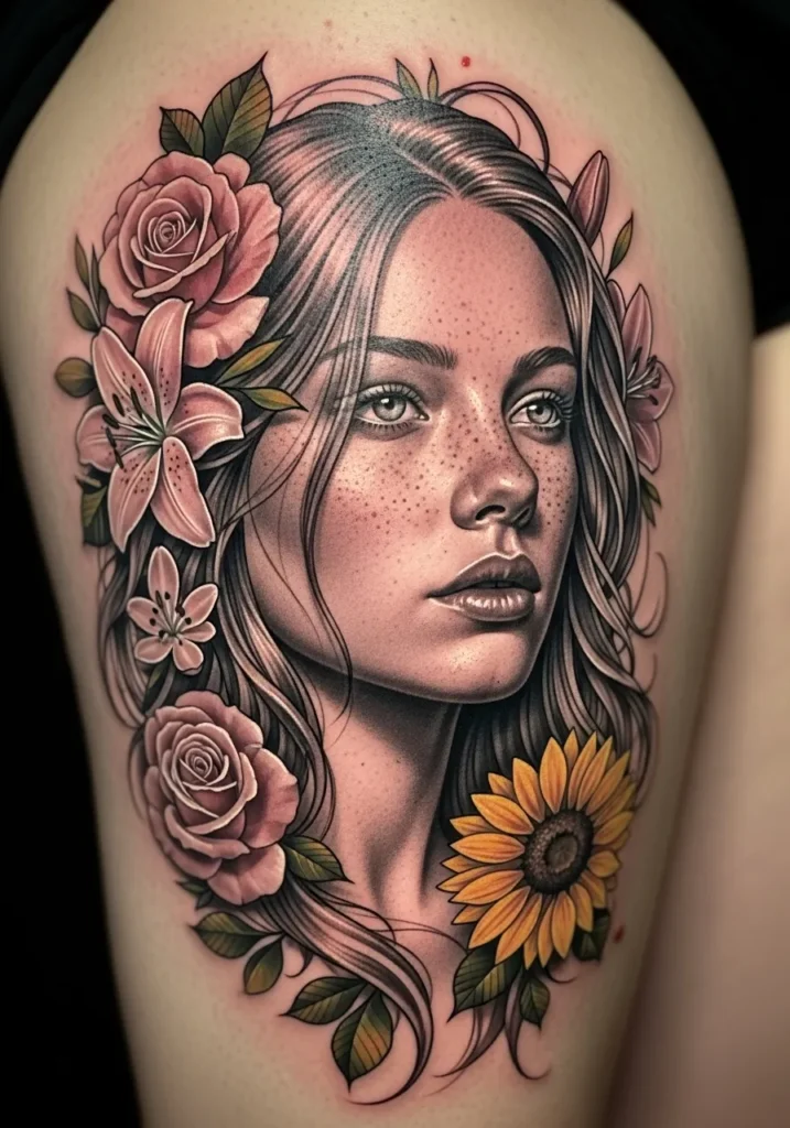 This breathtaking piece features a lifelike female portrait surrounded by detailed blooms including roses, lilies, and a sunflower. The artist s soft shading and muted tones give it a cinematic feel, with every freckle, hair strand, and petal looking perfectly balanced. The large size fits the thigh beautifully, creating a piece that feels both elegant and powerful.