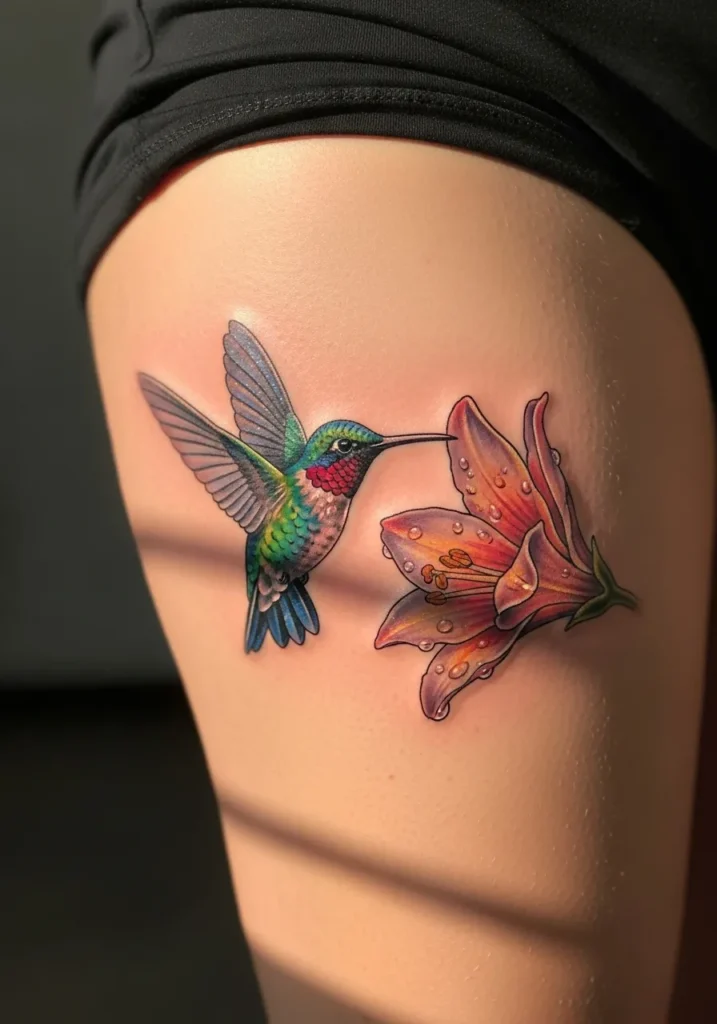This realistic thigh tattoo shows a tiny hummingbird hovering beside a blooming lily, both inked with incredible detail and color depth. The bird s iridescent feathers shimmer in green and blue hues, while the soft pink petals of the lily glisten with tiny dew drops. The medium size and placement on the upper thigh make it feel airy and elegant, like a fleeting moment frozen in time.