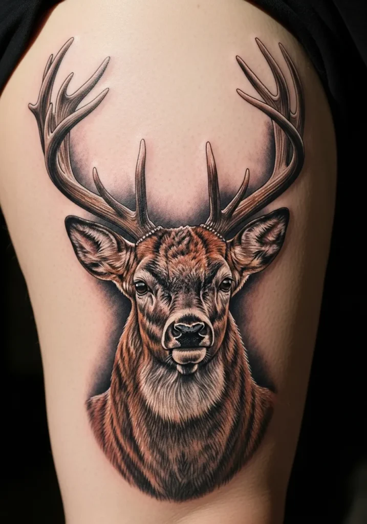 This lifelike deer tattoo features delicate antlers and warm brown tones that flow naturally across the thigh. The fine hair details and soft shading around the face make the design look incredibly realistic, giving it a calm, noble feel. It s large enough to stand out without overpowering the leg.