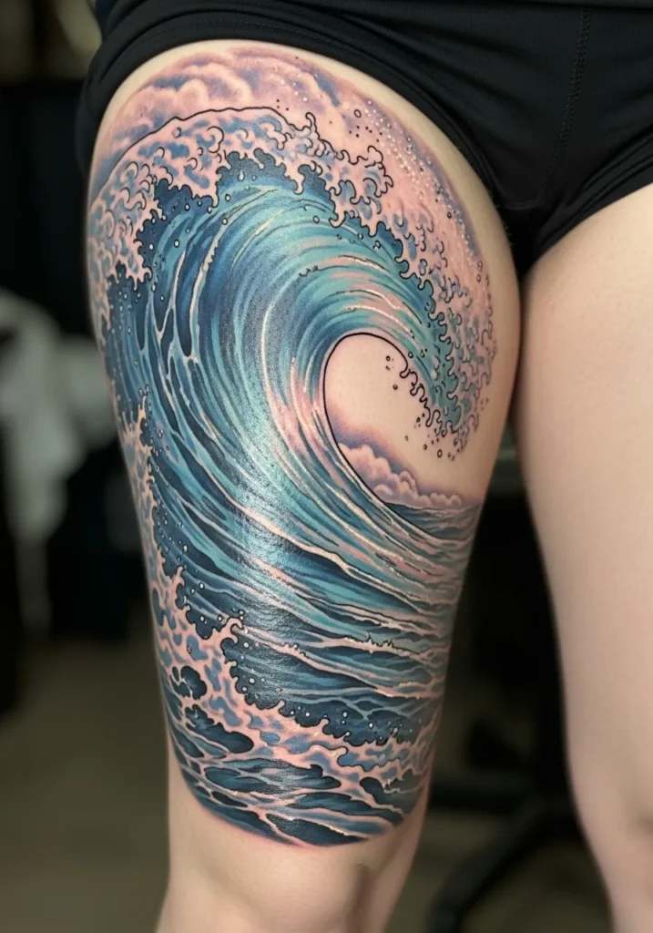 This stunning realism tattoo captures a crashing wave in motion, swirling across the thigh in shades of deep blue, turquoise, and soft pink. The fine detailing of each foam splash and ripple gives it a sense of power and movement, while the soft pastel undertones add a calming balance. The size and curve of the design flow naturally with the body s shape, making it dynamic and beautifully placed.
