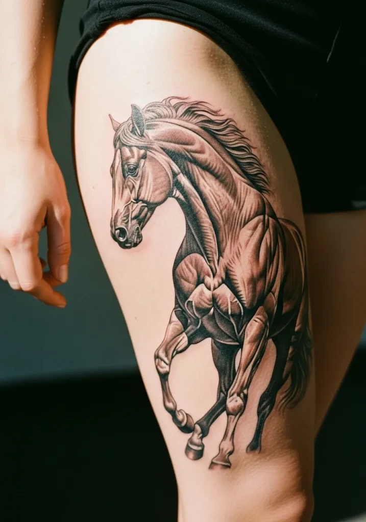 This realism tattoo features a powerful horse in motion, its muscles and mane detailed with precision and depth. The natural light and subtle shading make the animal look almost alive, as if it could leap off the skin. The vertical placement along the thigh emphasizes the sense of strength and grace in every line.