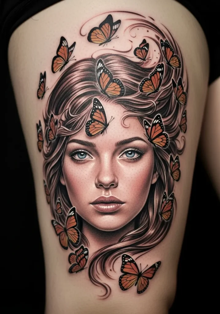 This gorgeous tattoo features a lifelike female portrait surrounded by fluttering monarch butterflies. The artist s fine shading brings her skin tone and hair texture to life, while the vivid orange and black butterflies add color and movement. The placement on the upper thigh gives the whole piece a dreamy, flowing composition that feels artistic and feminine.