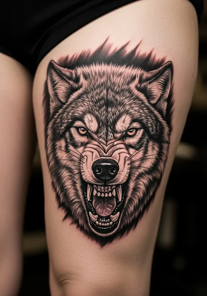 This stunning thigh tattoo captures the raw power of a snarling wolf in bold black and grey realism. The medium-to-large design spans the upper thigh, featuring fine shading that brings out every strand of fur, sharp fang, and intense gaze. The contrast between the soft skin tone and the deep ink gives the piece a vivid, lifelike presence that feels both wild and empowering.