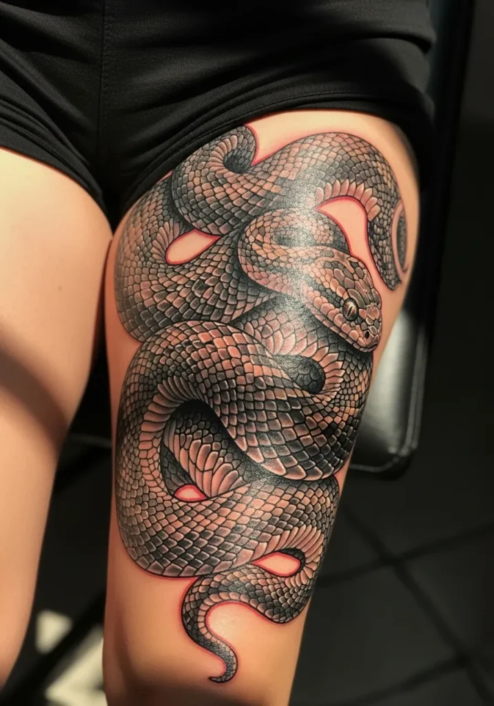 This realism-style snake tattoo winds elegantly across the thigh, its scales detailed with precise shading and soft color gradients that create a lifelike effect. The subtle touches of red outlining the coiled body add depth and drama, while the placement accentuates the thigh s curves beautifully. The overall design feels sleek and commanding without being overly aggressive.
